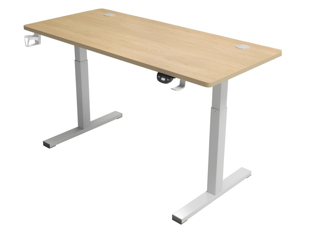 Elektricky nastaviteľný stôl 140 cm – výška 72–118 cm, svetlohnedý štýl s bielym rámom, LED