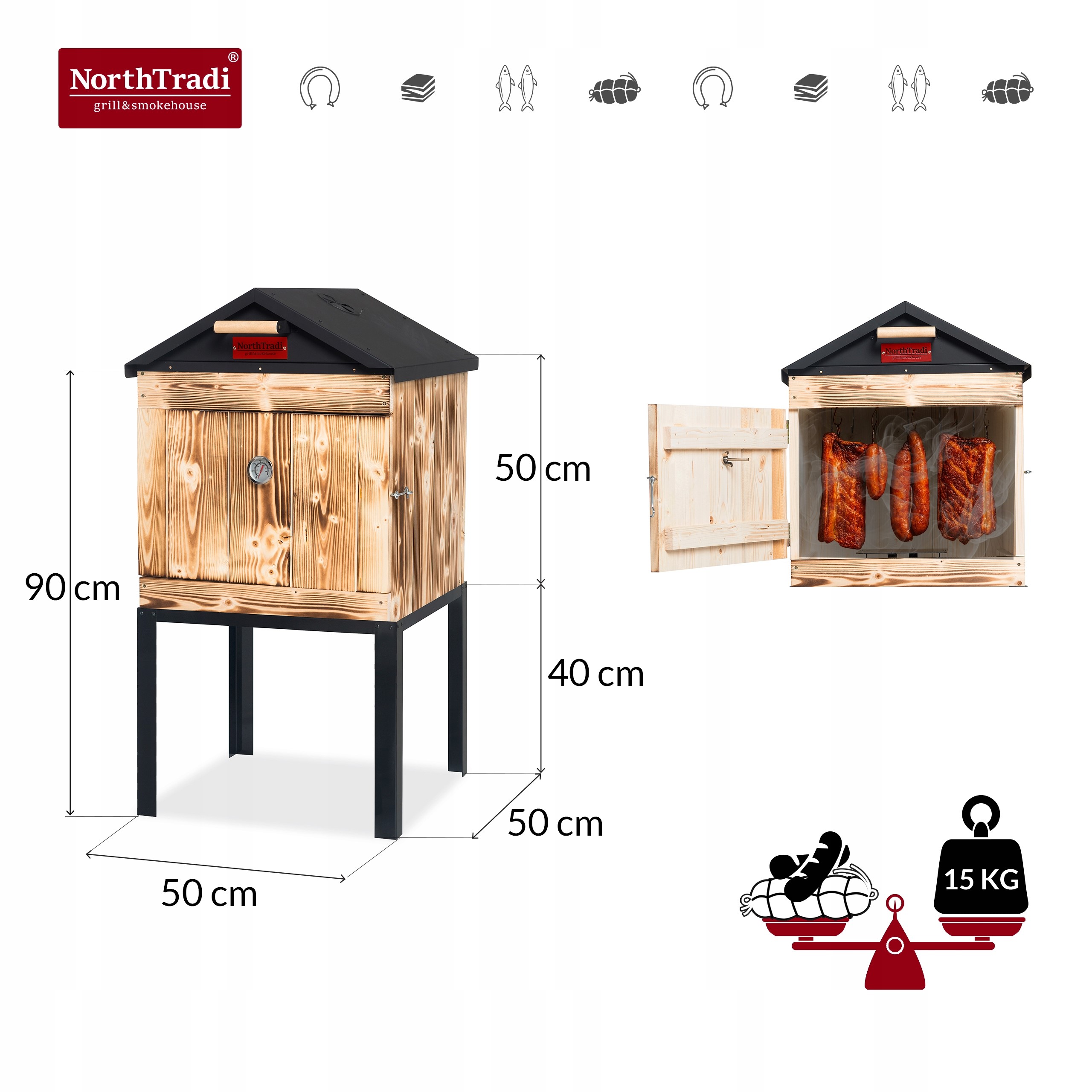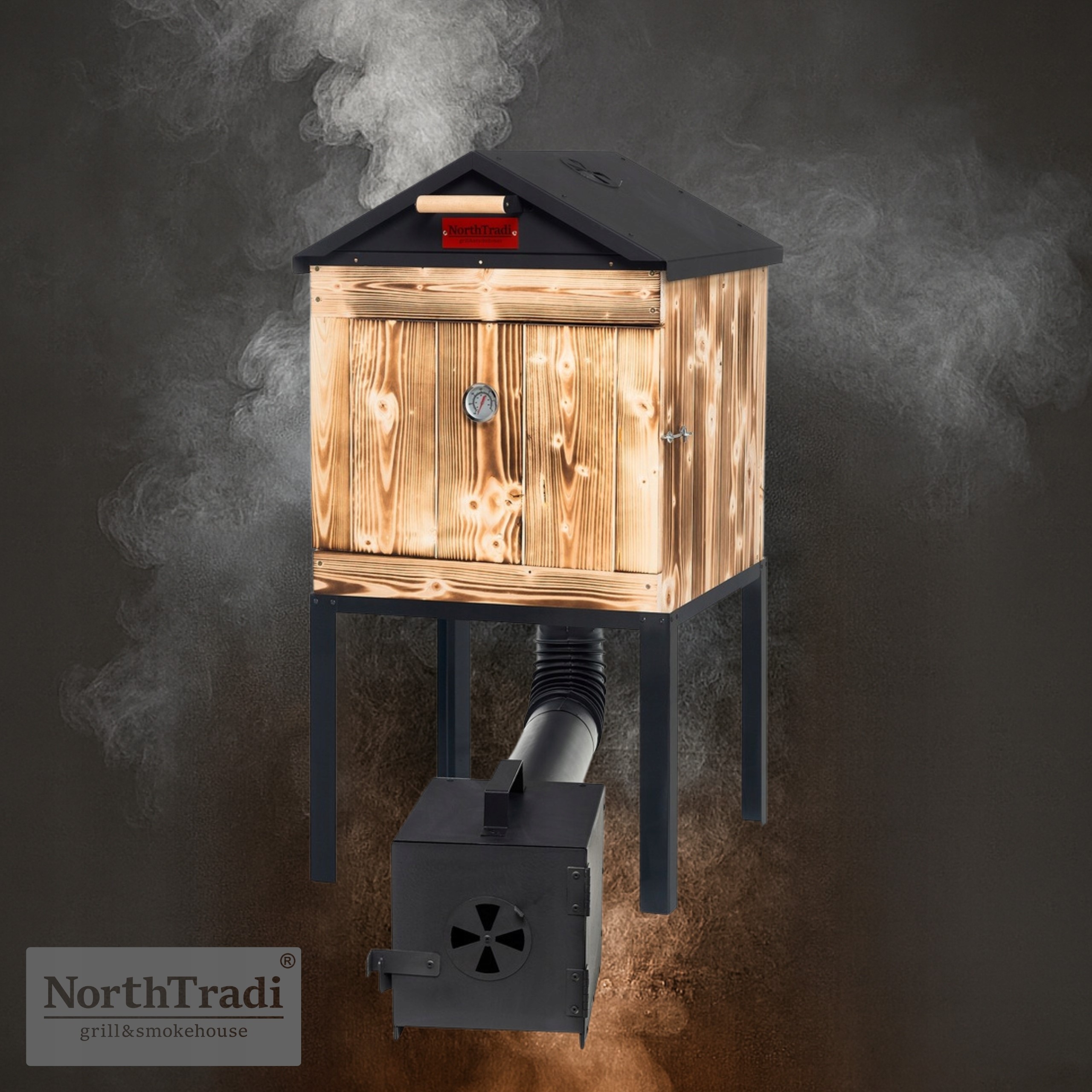 Chcete doma údiť tradične, čisto a s opakovateľným výsledkom? Táto drevená udiareň NorthTradi s kovovou strechou spája komoru zo škandinávskeho smreku s robustným oceľovým páleniskom a premyslenou reguláciou dymu a teploty.