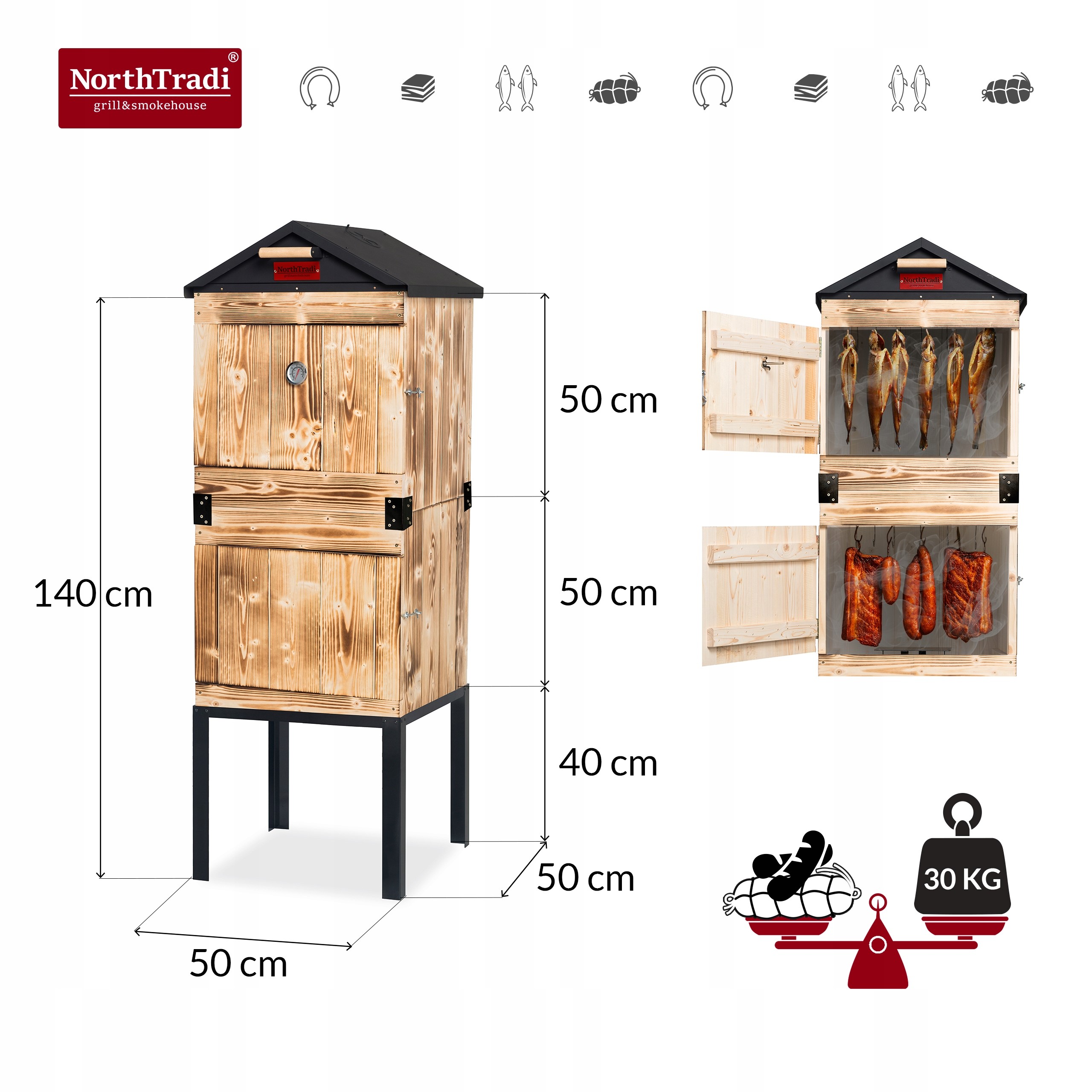 Vďaka dvom komorám zvládne až 30 kg mäsa alebo rýb, čo z nej robí ideálnu voľbu pre náročných milovníkov údenia.